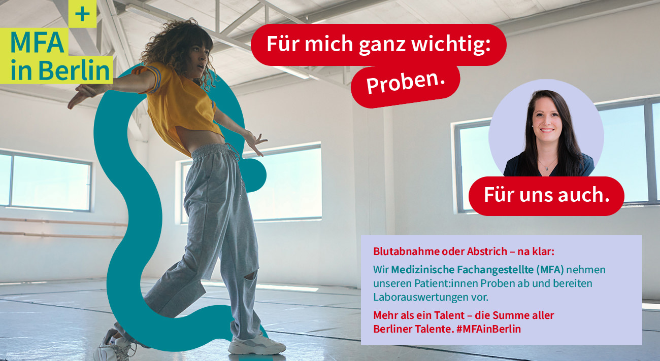 Sie möchten den Ausbildungsberuf Medizinische:r Fachangestellte:r sichtbar machen? Um auch in Zukunft viele Jugendliche für die Ausbildung zu begeistern, hat die Ärztekammer Berlin Anfang Oktober eine Kampagne zur Förderung des Berufsbildes Medizinische:r Fachangestellte:r (MFA) initiiert. Den Anfang hat unsere neue Website www.mfa-in-berlin.de gemacht, der eine Social-Media Reihe gefolgt ist.